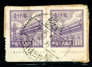 China 1950 PRC $1000 Violet 1st Gate Early Postal History Sc #16 On Piece U453