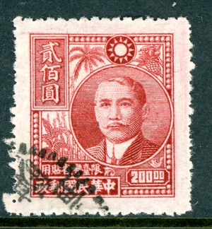Free China 1947 Taiwan Republic $200.00 Dark Red Sc 49 VFU P72