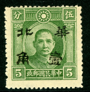 The base stamp is the New Peking Print SYS. The top overprint is the full value overprint. The bottom surcharge (half value, 10 cents) was applied in Kalgan. (Bottom Kalgan surcharges are also known in red.)Unlisted in catalogs. Documented and researched in the China Stamp Society Journal Volume 57, No.3 and Vol 72 No.4. There is also an excellent article by Steve Frumkin with a full listing in the China Philatelic Society of London Journal entitled, "Japanese Occupation of China 'Clandestine Surcharges'.