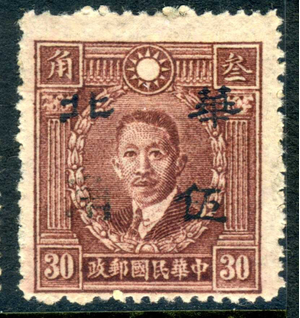The base stamp is the New Peking Print Martyr. The top overprint is the full value overprint. The bottom surcharge (half value, 50 cents, in BLACK) was applied in Kalgan. Unlisted in catalogs. Documented and researched in the China Stamp Society Journal Volume 57, No.3 and Vol 72 No.4.
