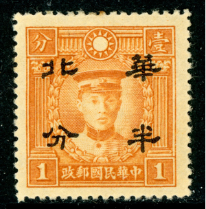 North China 1945 Japan Occ ½ Value OP on 1¢ Peking Martyr Low/Narrow Mint J327