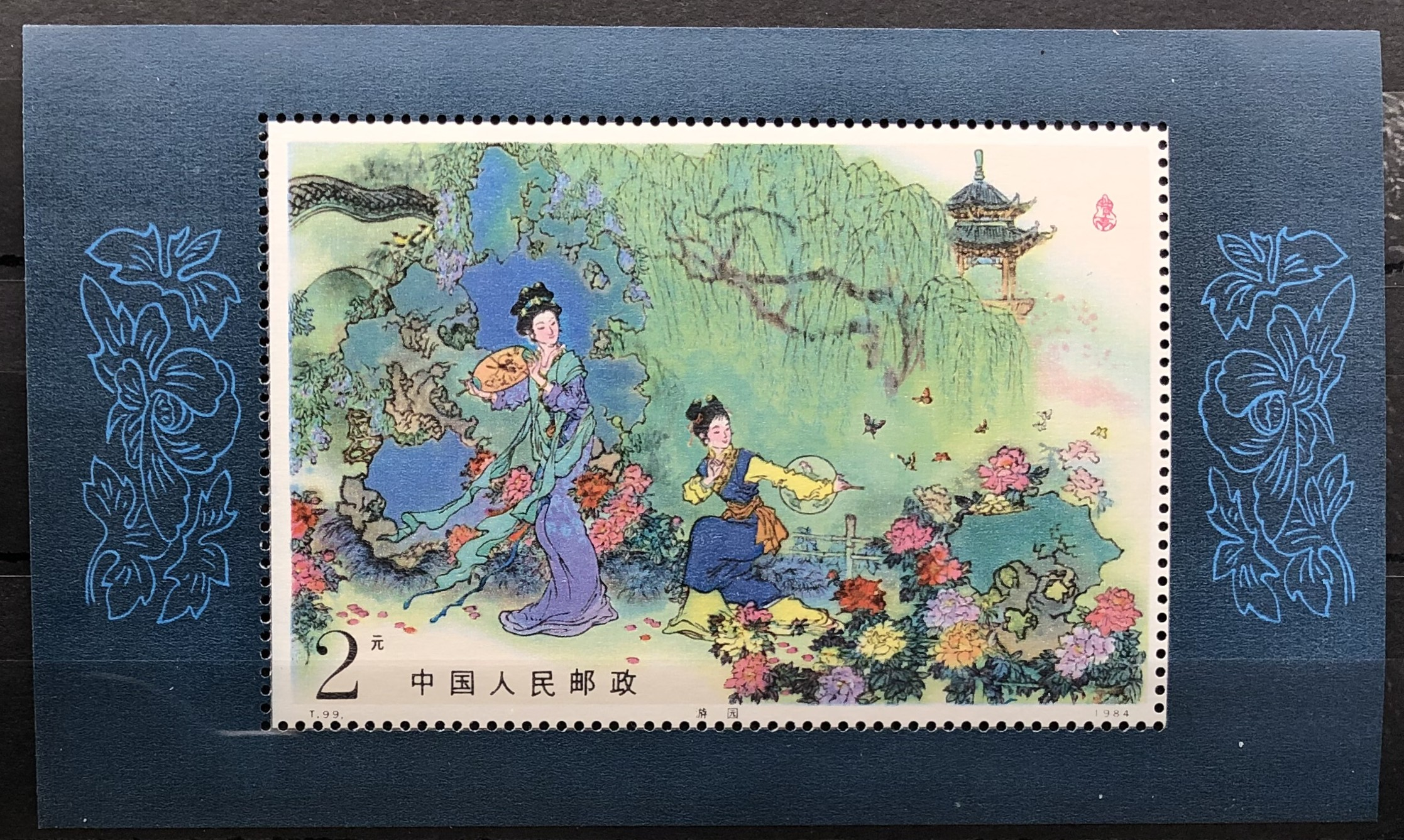Playing in the garden, scenes from The Peony Pavilion by Tang Xianzu, 1984. Souvenir sheet.