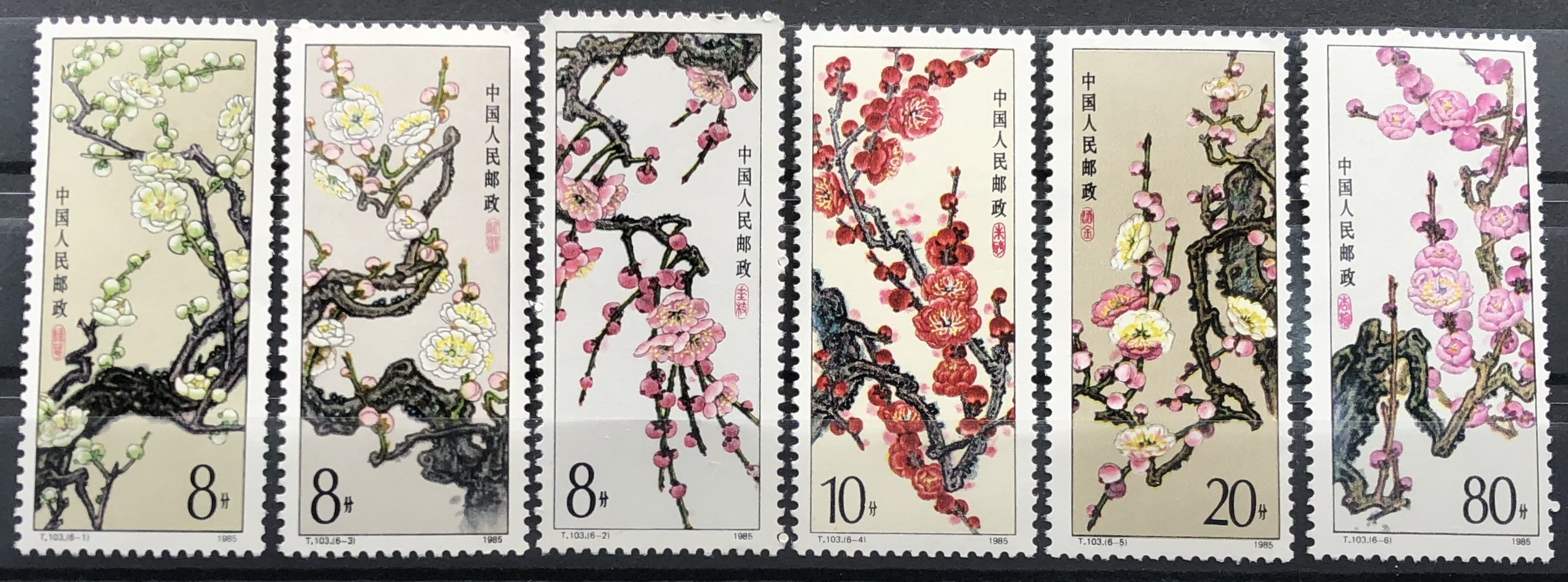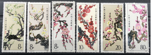Mei, Green calyx, Pendant mei, Contorted dragon, Cinnabar, Versicolor mei, Apricot mei, 1985. Complete set of 6.