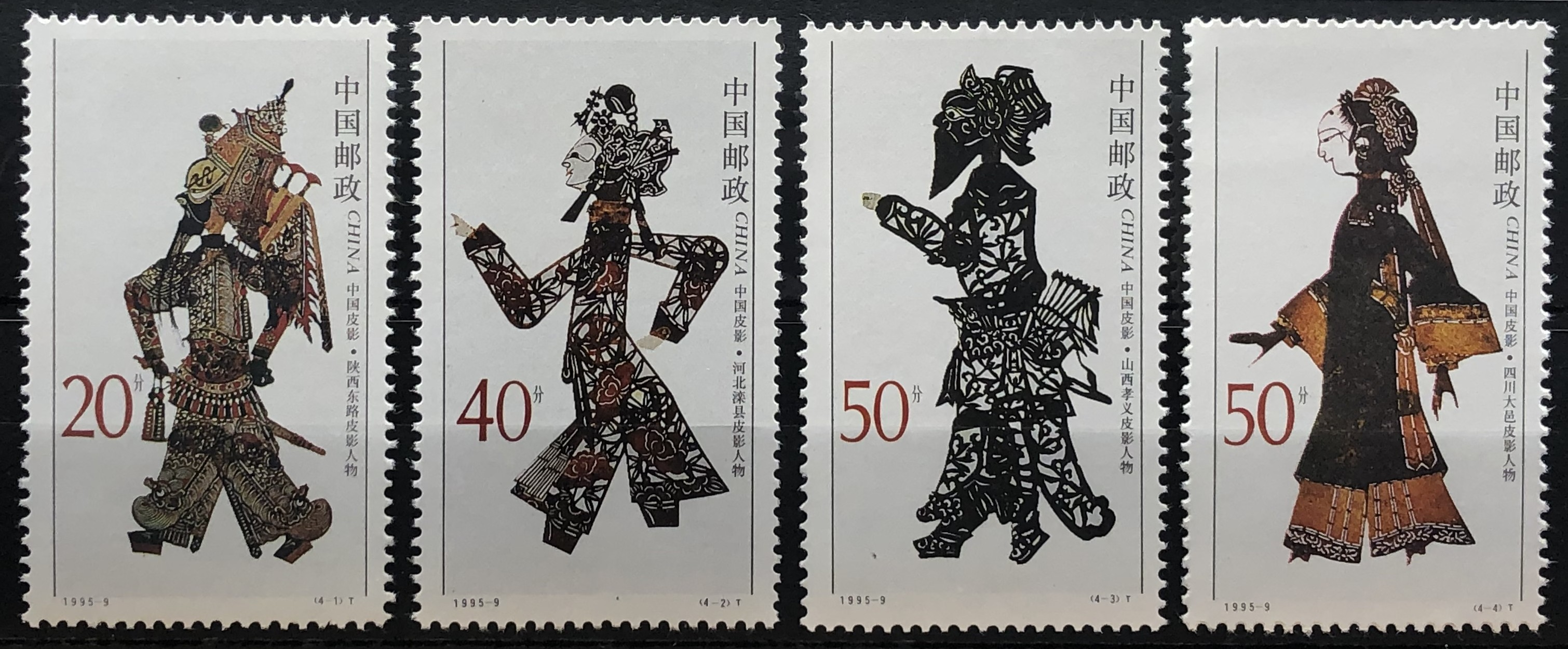 Shadow play, various costumed characters, 1995. Complete set of 4.