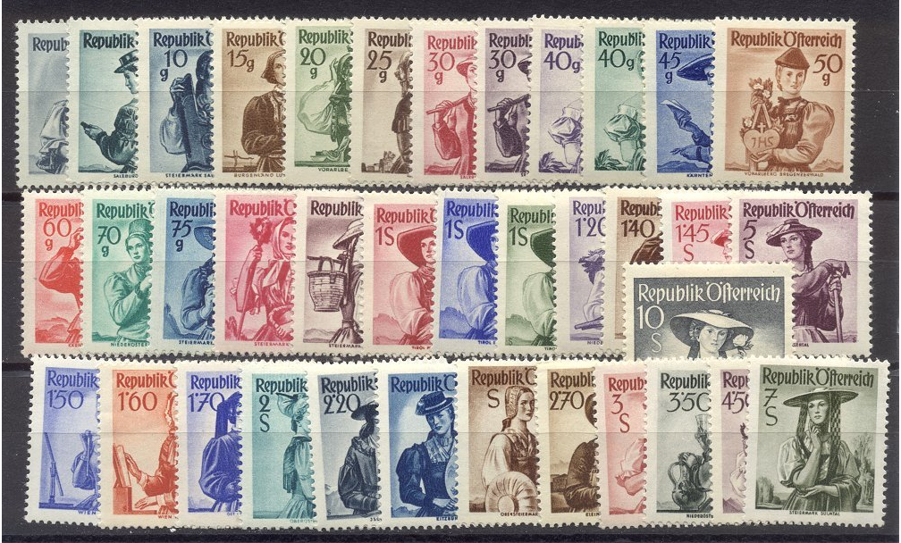 Scott #520-56: 1948 Costumes Set Centering & Condition: Mint. Fresh. Very Fine set. Reverse (Gum Side): Original gum. Never Hinged. Faults / Imperfections: None The item pictured is the actual item you are purchasing, unless otherwise noted. I also offer an interest-free layaway plan. Ask me about it!" All items will be mailed a day or two after payment is received. -------------------------------------------------------------------------------- Please click any of the following to read: |