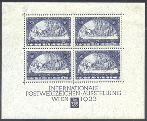 Scott #B111: 1933 WIPA Sheet Centering & Condition: Mint. Fresh. Very Fine and SCARCE Sheet. Reverse (Gum Side): See above Faults / Imperfections: Small thin in the selvage The item pictured is the actual item you are purchasing, unless otherwise noted. I also offer an interest-free layaway plan. Ask me about it!" All items will be mailed a day or two after payment is received. --------------------------------------------------------------------------------