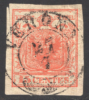 Austria-Lombardy-Venetia Scott 4D. Used. Cto. Very trivial thin.