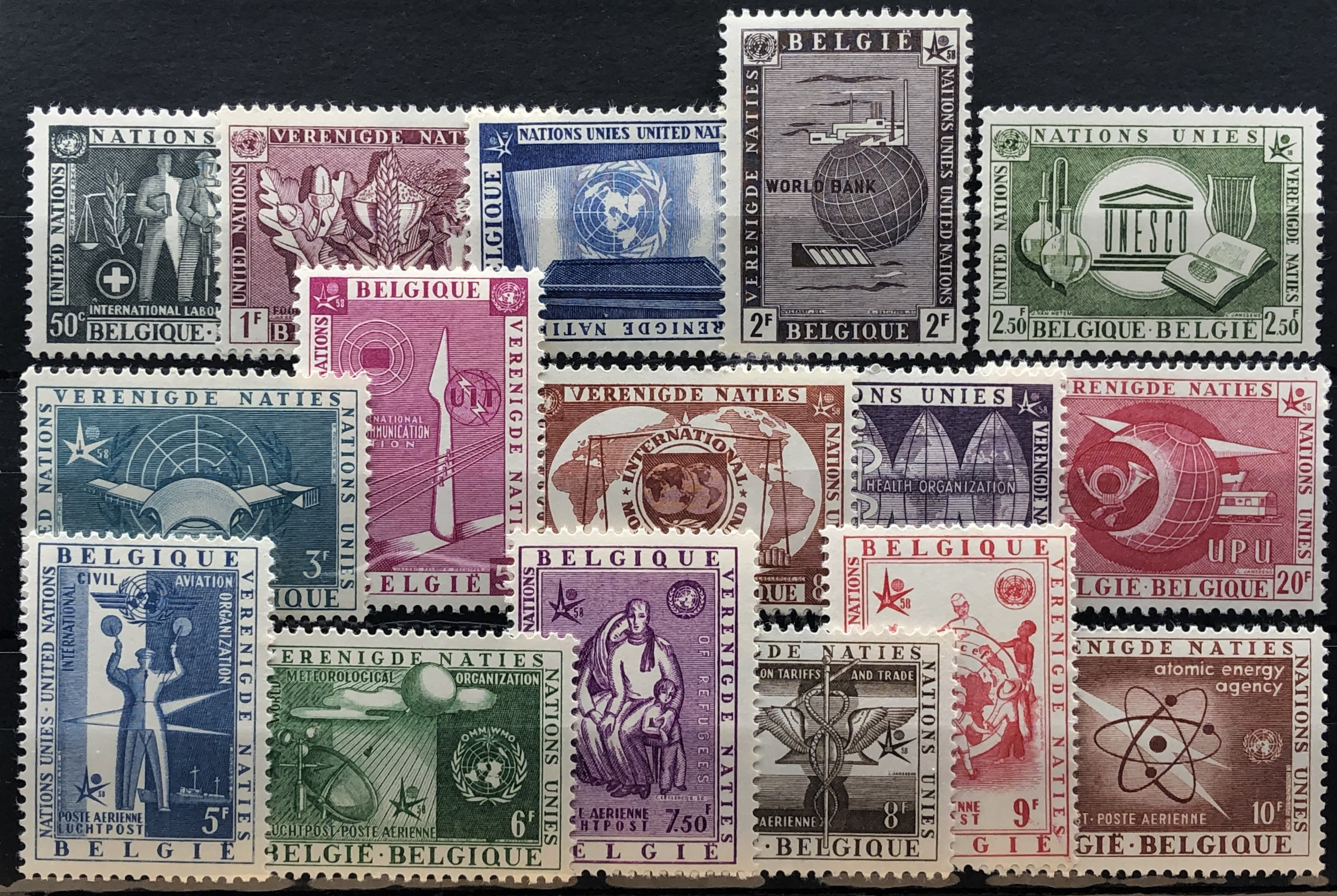 United Nations Issue, World's Fair, Brussels, 1958. Postally valid only from the UN pavilion at the Brussels Fair. Complete set of 16.
