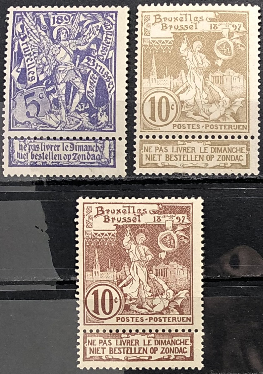 St. Michael and Satan, 1896-97. Brussels Exhibition Issue. Complete set of 3 with labels.