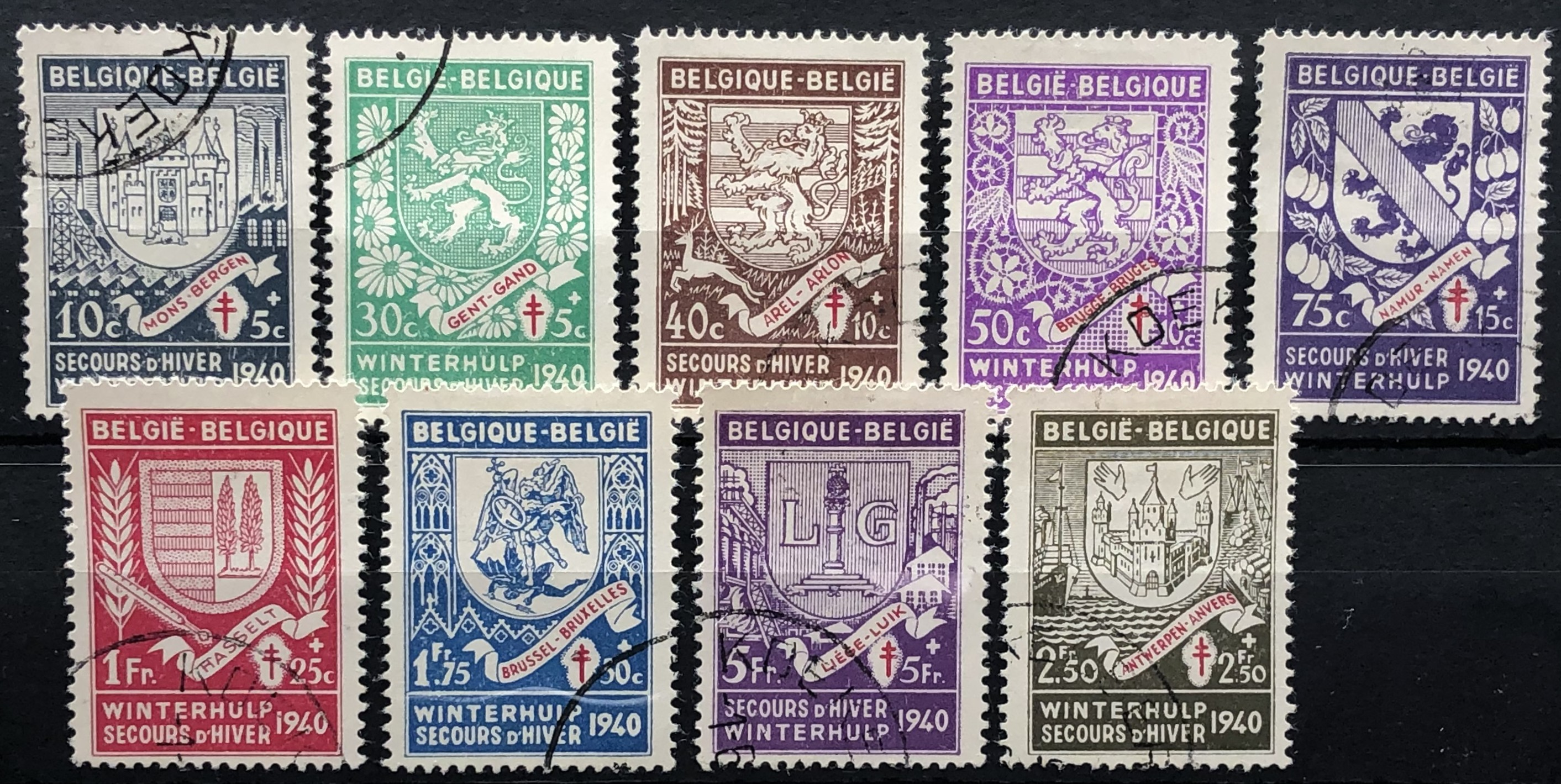 Arms type of 1940-41. Cross and city name in carmine, 1941. Complete set of 9.