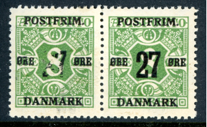 Denmark 1918 Definitive 27o/8o Green Perf 14x14½ Scott #148 Pair Variety K638