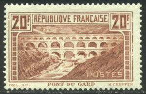 Scott #253: 1929 20fr Pont du Gard, Type I Centering & Condition: Mint. Fresh. Fine. Reverse (Gum Side): Original gum. Never Hinged. Faults / Imperfections: None The item pictured is the actual item you are purchasing, unless otherwise noted. I also offer an interest-free layaway plan. Ask me about it!" All items purchased will be mailed a day or two after payment is received. --------------------------------------------------------------------------------