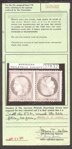 Scott #57b: 1870 20c Blue, Tete-Beche Pair Centering & Condition: Unused. Fine and SCARCE item. An APS Certificate accompanies. Reverse (Gum Side): Without gum. Faults / Imperfections: None The item pictured is the actual item you are purchasing, unless otherwise noted. I also offer an interest-free layaway plan. Ask me about it!" All items will be mailed a day or two after payment is received. --------------------------------------------------------------------------------