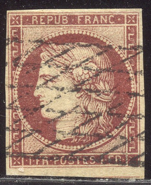 Scott #9c: 1849 1fr Dark Carmine Centering & Condition: Used. Rich color. Margins all around. Fine-Very Fine. Reverse (Gum Side): N/A Faults / Imperfections: None The item pictured is the actual item you are purchasing, unless otherwise noted. I also offer an interest-free layaway plan. Ask me about it!" All items purchased will be mailed a day or two after payment is received. --------------------------------------------------------------------------------