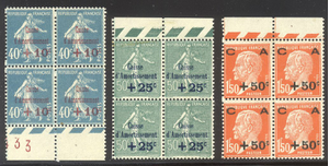 Scott #24-26: 1927 Surcharges Set Centering & Condition: Mint. Fresh. Fine-Very Fine set of Margin Blocks. Reverse (Gum Side): Original gum. All stamps Never Hinged EXCEPT Top (2) B24. Faults / Imperfections: None The item pictured is the actual item you are purchasing, unless otherwise noted. I also offer an interest-free layaway plan. Ask me about it!" All items will be mailed a day or two after payment is received. --------------------------------------------------------------------------------