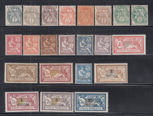 France Offices in Levant, 21-38 +color vars, sm. thin on dup 5c & 2Pi Scott$726+