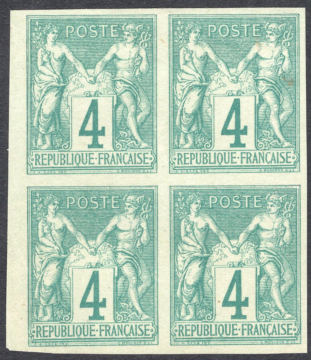 French Colonies Scott 25. Block of 4. Unused. No gum. Trivial corner crease. 4