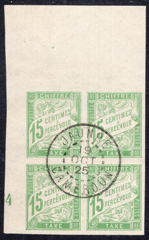 French Colonies Scott J17. Used. Corner block of 4 with plate number. 6