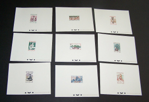 Scott #119//132: 1960 Pictorials Centering & Condition: Mint. Fresh. Very Fine group of (9) Deluxe Die Proofs. Reverse (Gum Side): Faint mount marks in corners Faults / Imperfections: None The item pictured is the actual item you are purchasing, unless otherwise noted. I also offer an interest-free layaway plan. Ask me about it!" All items will be mailed a day or two after payment is received. --------------------------------------------------------------------------------