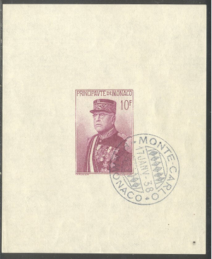 Scott #159: 1938 10fr Prince Louis S/S Centering & Condition: Used. Very Fine sheet. Reverse (Gum Side): N/A Faults / Imperfections: None The item pictured is the actual item you are purchasing, unless otherwise noted. I also offer an interest-free layaway plan. Ask me about it!" All items will be mailed a day or two after payment is received. --------------------------------------------------------------------------------