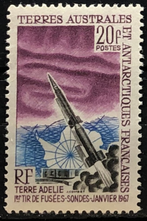 Aurora Australis, Map of Antarctica and Rocket. Launching of the first space rocket from Adelie Land, 1967. Single.*The item shown may be an example because there are two or more in stock.