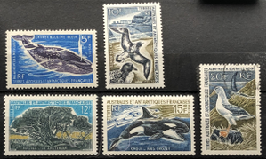 Great Blue Whale, Black-browed Albatross, Cape pigeons, Phylica trees, Amsterdam Island, Killer whale (orca), 1966-69. Complete set of 5, 25-27A (MNH), 28 (used).