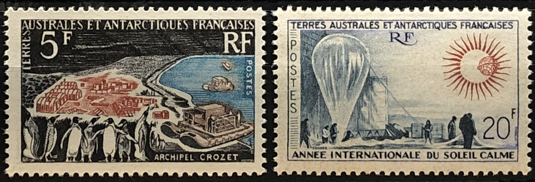Penguins and Camp Crozet Island, Research station and IQSY emblem, 1963. International Quiet Sun Year. Complete set of 2.