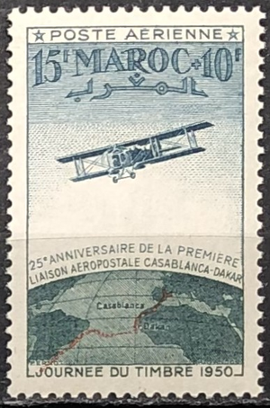 Plane over globe, stamp day, 1950. 25th anniversary of the 1st post link between Casablance and Dakar. Single. *The item shown may be an example because there are two or more in stock.