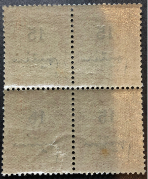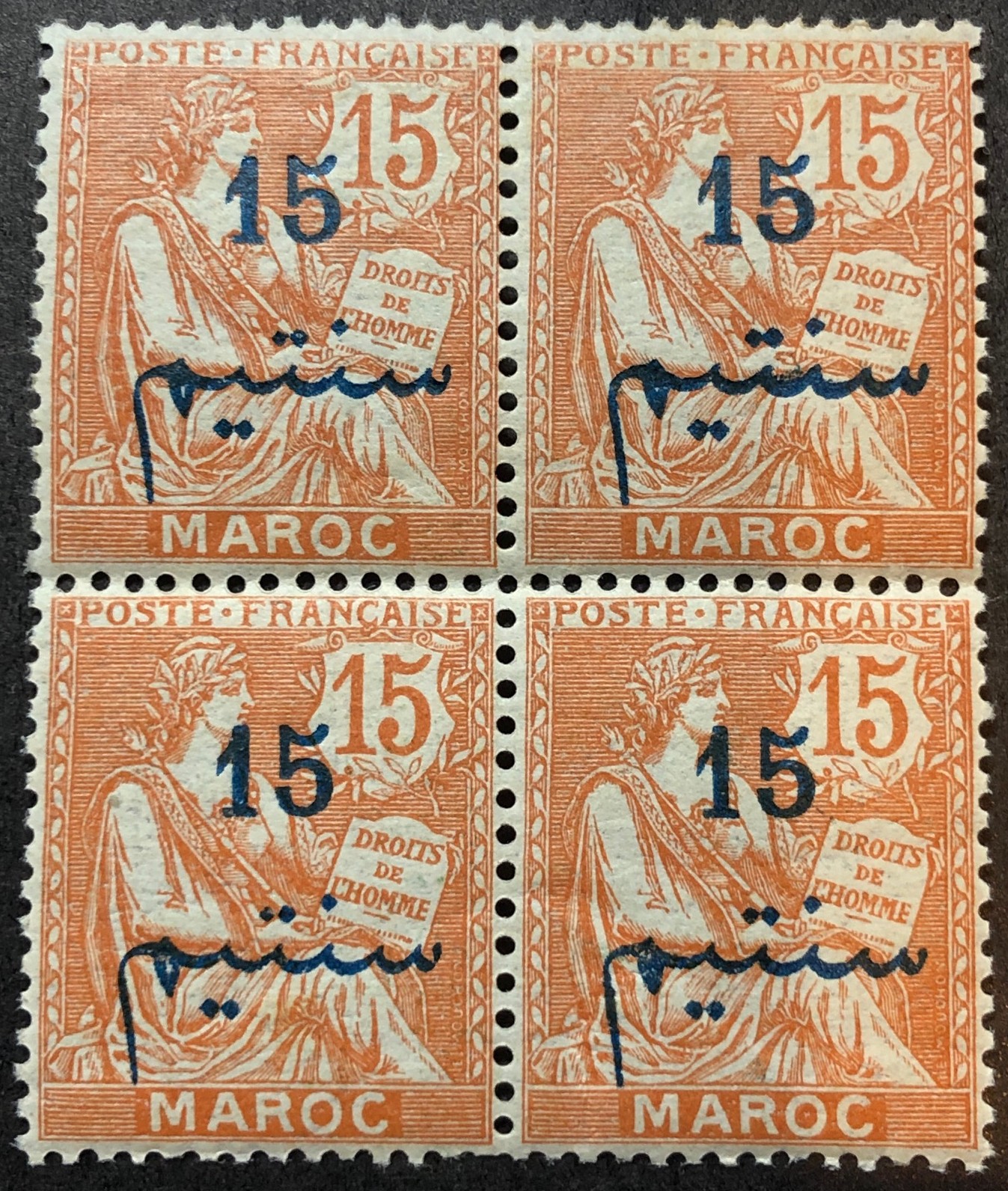 Rights of man surcharged in blue, 1911-17. Block of 4.