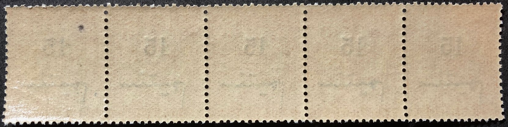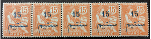 Rights of man surcharged in blue, 1911-17. Strip of 5.
