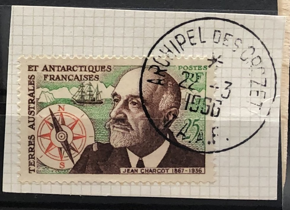 Charcot, compass rose, and "Pourquoi-pas?", 1961. 25th anniversary of the death of Commander Jean Charcot, Antarctic explorer. Single, on piece with Crozet cancel.
