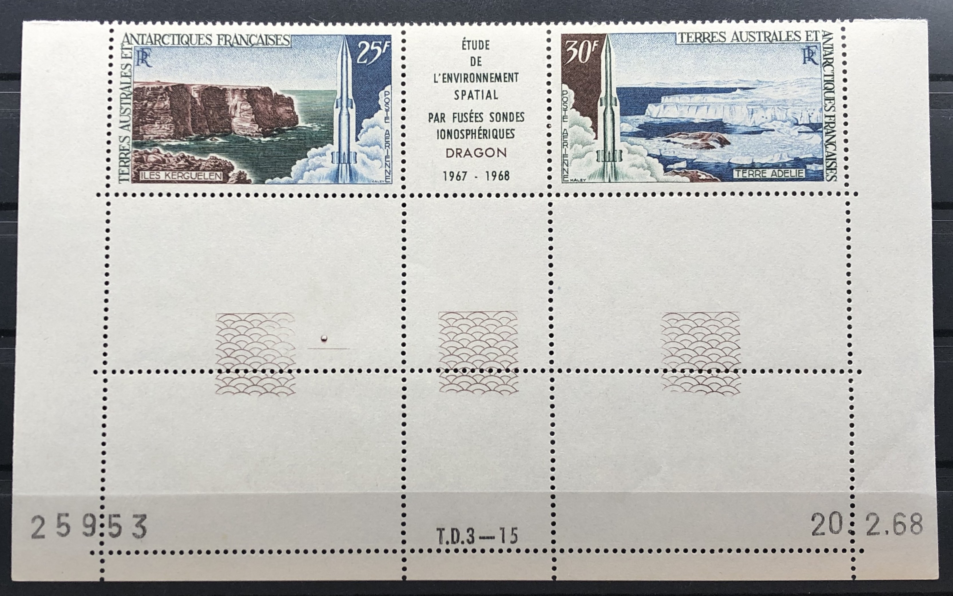 Space exploration with Drago rockets, 1968. Pair + label.