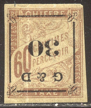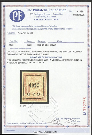 Scott #13c: ; 1903 30c on 60c Brown Centering & Condition: Mint. Fine-Very Fine and RARE. A Foundation certificate accompanies. Reverse (Gum Side): Original gum. Hinged. Faults / Imperfections: Vertical crease ending in a tiny tear The item pictured is the actual item you are purchasing, unless otherwise noted. I also offer an interest-free layaway plan. Ask me about it!" All items purchased will be mailed a day or two after payment is received. --------------------------------------------------------------------------------