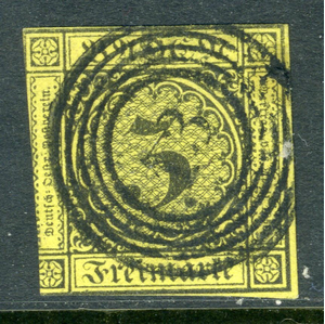 Germany 1851 Baden 3kr Yellow Scott #2 VFU A384