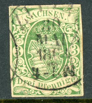 Germany 1851 Saxony 3pfg Green Scott #2 VFU L160