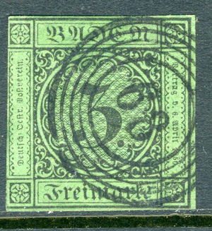 Germany 1853 Baden 3kr Yellow Green Scott #7 VFU A387