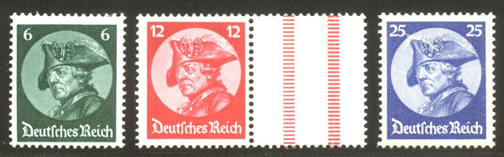 Scott #398-400: 1933 Frederick the Great Set Centering & Condition: Mint. Fresh. Very Fine set. Reverse (Gum Side): Original gum. Never Hinged; #398 has a small disturbance. Faults / Imperfections: None The item pictured is the actual item you are purchasing, unless otherwise noted. I also offer an interest-free layaway plan. Ask me about it!" All items will be mailed a day or two after payment is received. ![]() ![]() ![]() --------------------------------------------------------------------------------