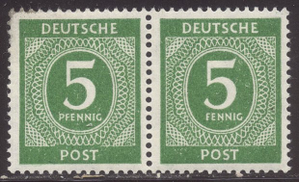 Scott #534 var: 1946 5pf Yellow Green, "FENNIG" Centering & Condition: Mint. Fresh. Very Fine Pair with the right stamp Reverse (Gum Side): Original gum. Never Hinged. Faults / Imperfections: Tiny gum soak upper left The item pictured is the actual item you are purchasing, unless otherwise noted. I also offer an interest-free layaway plan. Ask me about it!" All items will be mailed a day or two after payment is received. --------------------------------------------------------------------------------