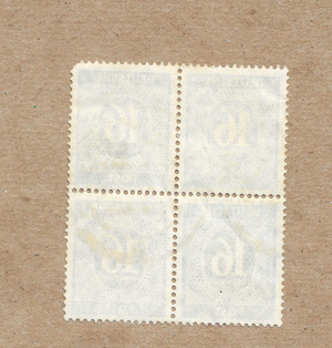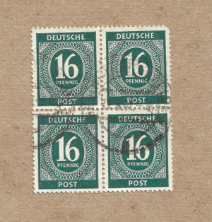 This is a block of four 16 Pfennig Allied Occupation stamps from Germany in 1946. These green-colored stamps, with Scott catalog number 542, were used in Germany and its colonies during the post-World War II period. The block of stamps is a piece of European philatelic history, representing the time when Germany was under Allied occupation.
