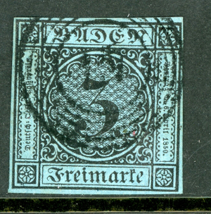 Germany States 1853 Baden 3 Kr Black/Blue Scott #8 VFU G412