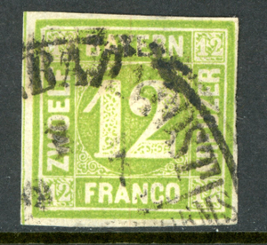 Germany States 1862 Bavaria 12 Kreuzer Yellow Green Scott #13 VFU K781