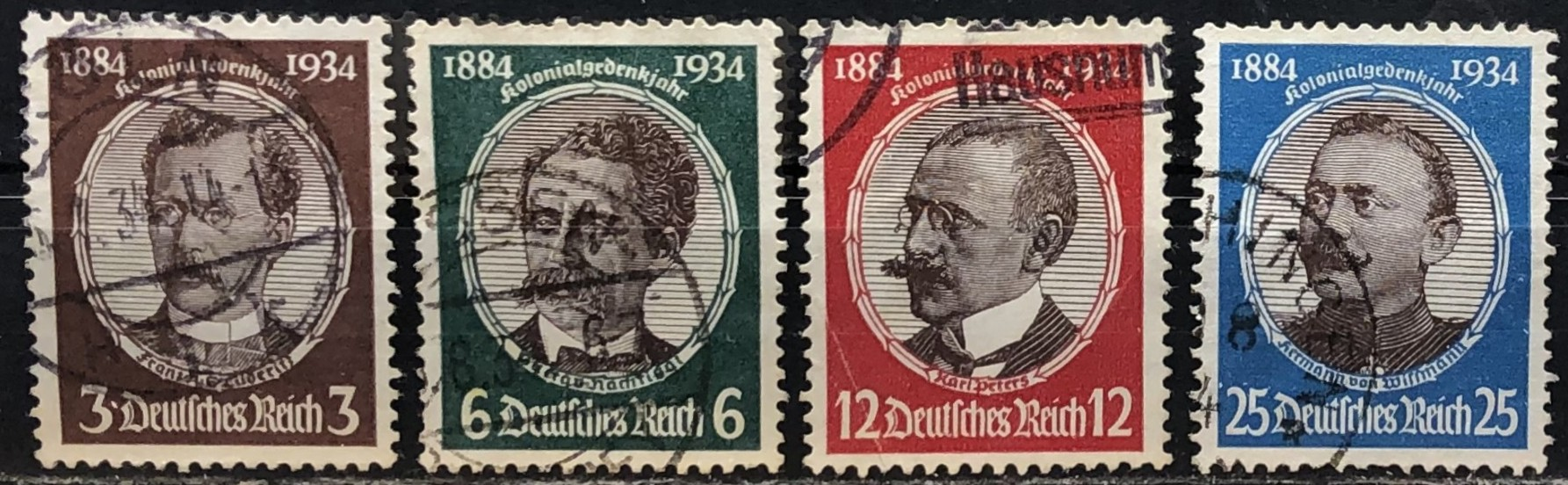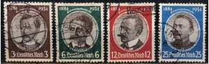 Karl Peters, Franz Adolf E. Luderitz, Dr. Gustav Nachtigal, Hermann von Wissmann, 1934. Issued in remembrance of the lost colonies of Germany. Complete set of 4.