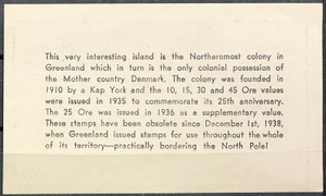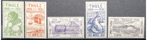 Thule 25th Anniversary set: Knud Rasmussen (10 ore, scarcest stamp of the set), Danish flag with Thule Mountain in background (15 ore), Church with Thule Mountain in background (25 ore), Walrus (30 ore), Polar Bear and Cape York (45 ore), 1935-36. Complete set of 5.