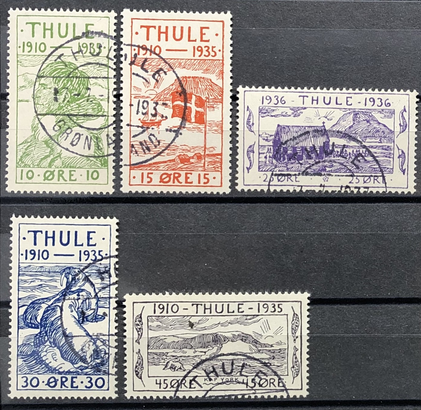 Thule 25th Anniversary set: Knud Rasmussen (10 ore, scarcest stamp of the set), Danish flag with Thule mountain in background (15 ore), Church with Thule Mountain in background (25 ore), Walrus (30 ore), Polar Bear and Cape York (45 ore), 1935-36. Complete set of 5.