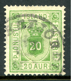 Iceland 1876 Official 20 Aur Yellow Green *Perf 14x13½* Scott #O8 VFU T851