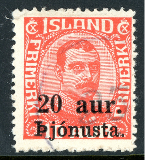 Iceland 1923 Official 20 Aurar/10 Aurar Red Scott # O52 VFU T801