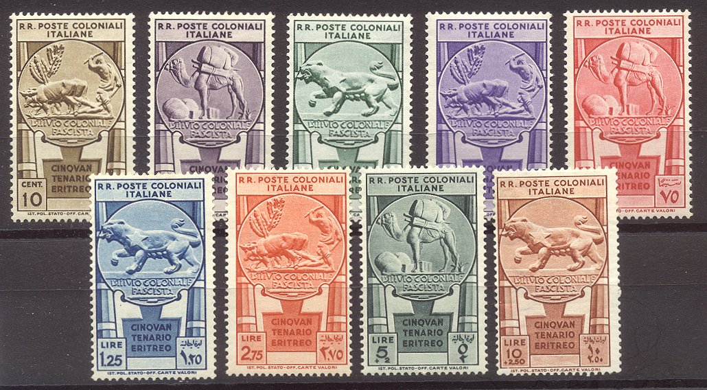 Scott #23-31: 1933 Annexation of Eritrea Set Centering & Condition: Mint. Fresh. Fine-Very Fine set. Reverse (Gum Side): Original gum. Never Hinged. Faults / Imperfections: None The item pictured is the actual item you are purchasing, unless otherwise noted. I also offer an interest-free layaway plan. Ask me about it!" All items will be mailed a day or two after payment is received. ![]() ![]() ![]() --------------------------------------------------------------------------------