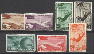 Scott #C29-35: 1934 World Soccer Set Centering & Condition: Mint. Fresh. Fine-Very Fine set. Reverse (Gum Side): Original gum. Lightly Hinged. Faults / Imperfections: None The item pictured is the actual item you are purchasing, unless otherwise noted. I also offer an interest-free layaway plan. Ask me about it!" All items will be mailed a day or two after payment is received. --------------------------------------------------------------------------------