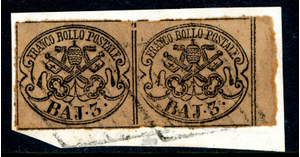 Italy 1852 Romans States 3 Baj Black on Brown Scott #4 PAIR VFU O191
