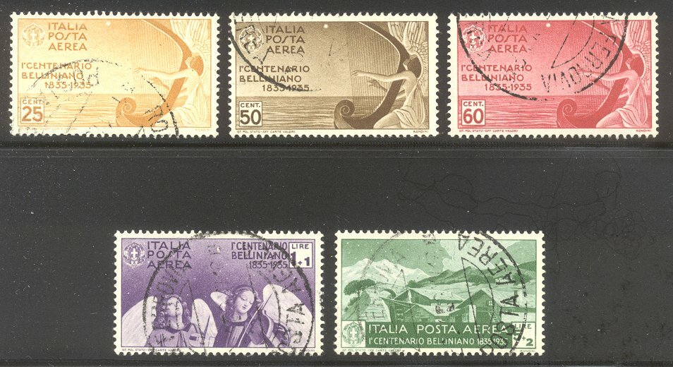 Scott #C79-83: 1935 Bellini Set Centering & Condition: Used. Very Fine set. Reverse (Gum Side): N/A Faults / Imperfections: None The item pictured is the actual item you are purchasing, unless otherwise noted. I also offer an interest-free layaway plan. Ask me about it!" All items will be mailed a day or two after payment is received. --------------------------------------------------------------------------------